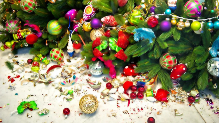First, it was twinkly lights. Nice. Then tinsel. Some shiny ornaments. An angel for the top. Plus, you must have a shining star. So an angel on top of a star! Construction paper chains and strings of popcorn and cranberries for a homey touch. And a big red bow that played “Jingle Bells” when anyone got near it. Then more tinsel so there weren’t any bare spots.